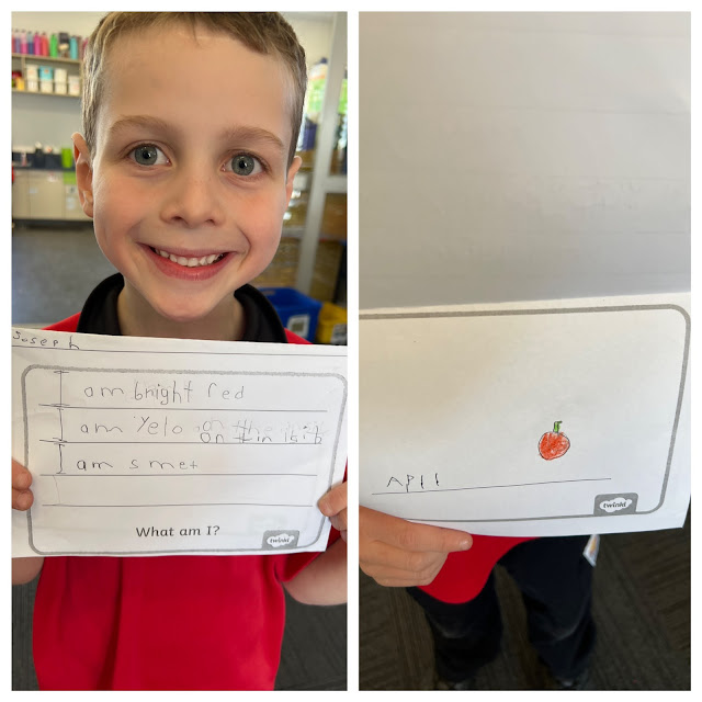 Today for writing the children got very creative (and had lots of fun) writing clues for their healthy eating riddle. The children each picked one fruit or vegetable and wrote 3-4 clues describing their chosen fruit or vegetable. Once they had done that they got to draw their fruit or vegetable on the inside of the flip card. The children loved sharing their clues with others and having them try and guess their fruit or vegetable.